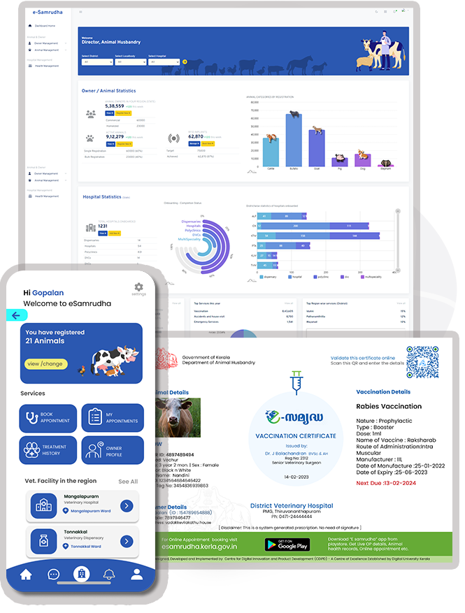 e-Samrudha is a digital livestock and e-Health Management system for Kerala. The project is initiated by Department of Animal Husbandry in Technical Collaboration with Digital university Kerala. e-Samrudha is being developed using the state of the art digital technology tools and brings a comprehensive digital platform for the Animal Husbandry and Dairy sector.. read more